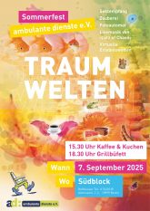 Auch dieses Jahr findet wieder ein Sommerfest von ambulante dienste e. V. statt – und zwar am Sonntag, den 07. September ab 15:30 Uhr. Unter dem Motto „Traumwelten“ wird es unter anderem Live-Musik von „Lutz of Chaos“ und virtuelle Erlebniswelten geben.